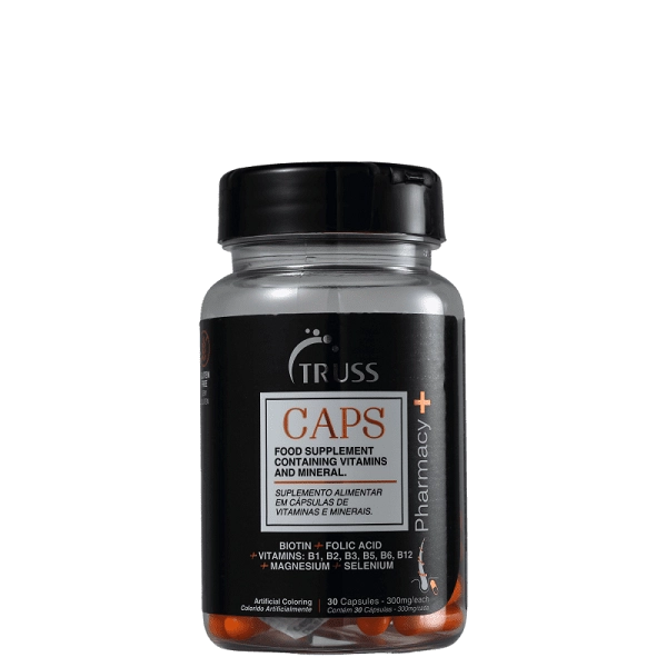 Complexo vitamínico para a saúde capilar. Truss Pharmacy+ Caps auxilia no crescimento capilar e na prevenção da queda. Suplemento Alimentar Truss Pharmacy+ Caps é rico em vitaminas e minerais, sendo de rápida absorção, para ajudar no fortalecimento dos fios e na hidratação interna da fibra capilar. Indicado para homens e mulheres, promove aumento da resistência do cabelo e brilho. Com ele, seus fios ficam fortes, nutridos e bonitos. Conselho de Aplicação Tome 1 cápsula por dia. Nossos Experts Ensinam Caso você seja gestante, consulte seu médico antes de iniciar o uso do suplemento. Truss Pharmacy+ Caps