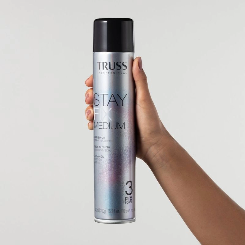 A linha de styling Stay Fix conta com sprays de jato seco que fixam o penteado sem pesar, ressecar ou enrijecer. Com efeito barreira sem fios arrepiados para uma finalização com aspecto de récem feita. Stay Fix Medium possui fórmula enriquecida com óleo de Argan e uma fixação de nível médio com maleabilidade, promovendo resistência adicional ao penteado. Contém óleo de Argan. Sugestão de AplicaçãoTruss Stay Fix Medium - Spray Fixador 450ml