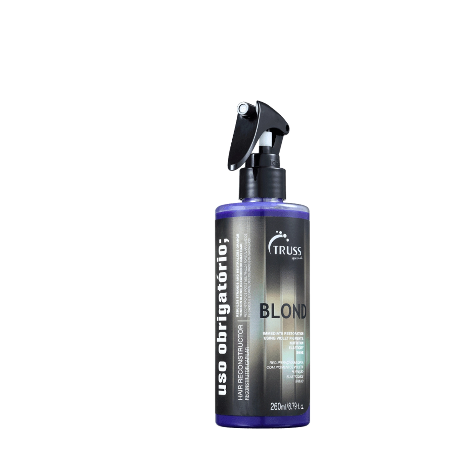 Tratamento reconstrutor e matizador para cabelos loiros, brancos descoloridos ou com luzes. Truss Uso Obrigatório Blond restaura a integridade dos fios ao mesmo tempo que neutraliza os tons amarelados e alaranjados indesejados para promover um efeito platinado bonito. Como a química, sobretudo a descoloração, danifica bastante os fios, Truss Uso Obrigatório Blond é rico em ativos que fortalecem, hidratam e nutrem, de forma encorporar o cabelo para que ele se torne mais resistente. Logo na primeira aplicação é possível sentir o resultado. Truss Uso Obrigatório Blond - 260ml