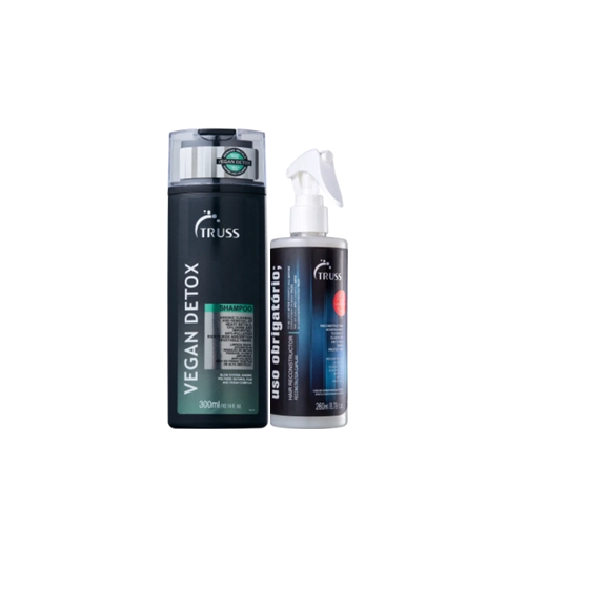 Shampoo para todos os tipos de cabelo. Truss Vegan Detox promove ação detox nos fios, limpando o couro cabeludo com gentileza. O Shampoo Truss Vegan Detox remove impurezas dos fios - como cloro, metais pesados e tons esverdeados. Sua formulação é 100% vegana e contém o ativo Natural Film: a fim de entregar uma capa protetora ao redor dos fios, para prevenir descamações e irritações capilares. Fórmula sem sal, corante, chumbo e petrolatos. Truss Uso Obrigatório Reconstrutor para cabelos danificados. Truss Uso Obrigatório recupera o aspecto saudável enquanto disciplina e protege do calor. O Tratamento Reconstrutor Truss Uso Obrigatório age com a reconstrução das partes do fio fragilizadas, a fim de restaurar a força e a resistência. A fórmula ainda conta com antioxidantes, que protegem dos danos causados por radicais livres ao mesmo tempo em que recupera os fios tingidos contra o desbotamento. Truss Uso Obrigatório recupera o aspecto saudável do cabelo quimicamente tratado, enquanto disciplina os fios, protege do calor do secador e evita a formação de pontas duplas.Truss Vegan Detox - Shampoo 300ml+Uso Obrigatório 260ml