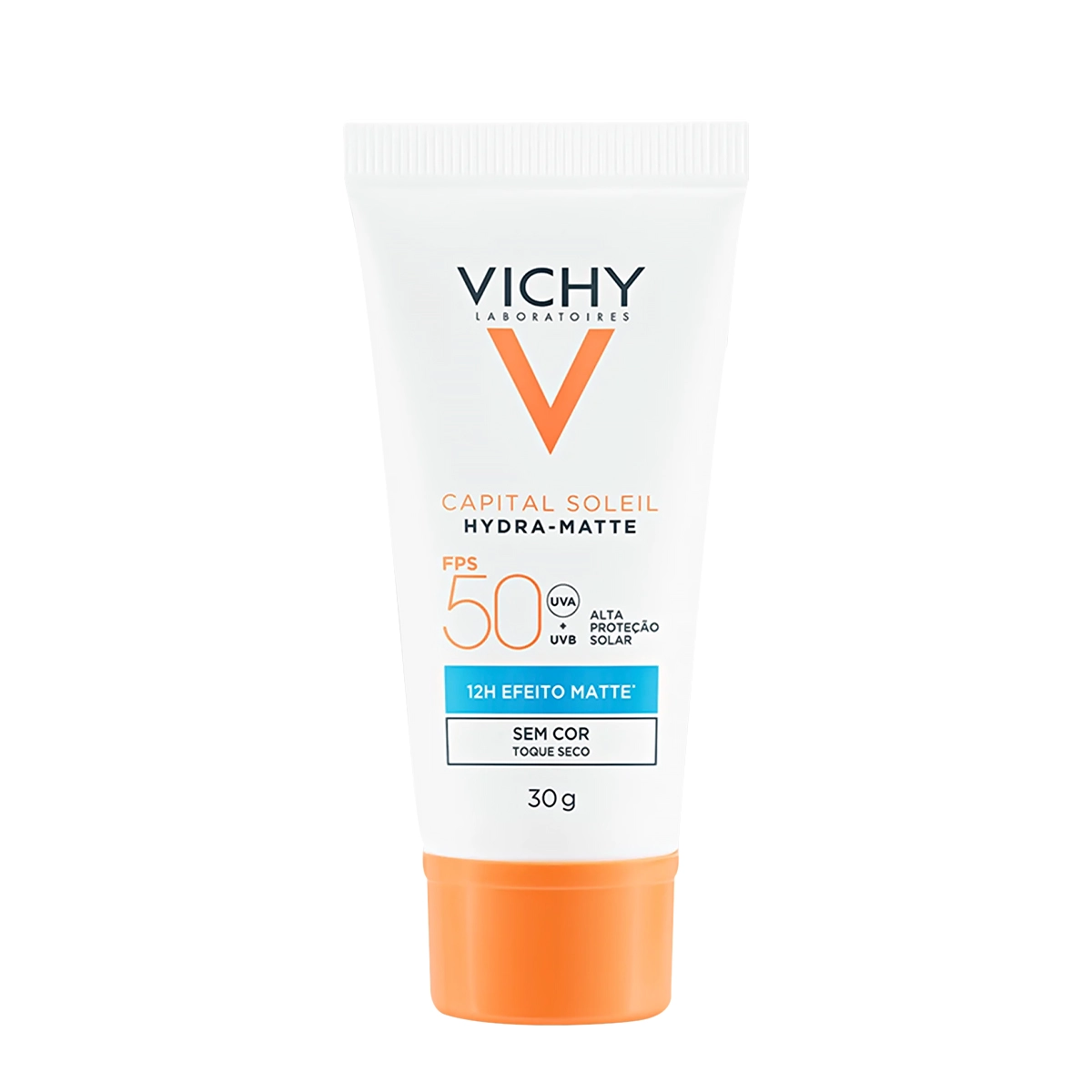 Protetor solar facial para todos os tipos de pele, especialmente as oleosas. Protege e hidrata por até 12 horas com efeito matte. Com textura leve e resistente à água, proporciona máxima proteção contra raios UVA e UVB. Garante uma aparência bonita e saudável para sua derme.Vichy Capital Soleil Hydra-Matte FPS50 - Protetor Solar Facial 30ml
