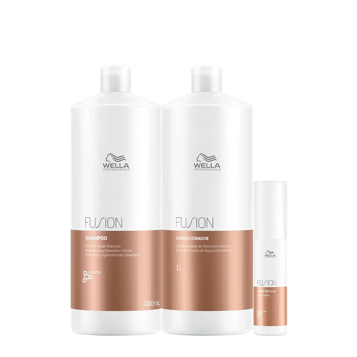 Wella Professionals Fusion Duo 1L e Tratamento Reconstrutor Kit em tamanho salão para cabelos danificados. Kit Wella Professionals Fusion Salon Duo ajuda a recuperar a fibra capilar dos danos e evita a quebra. Wella Professionals Fusion - Tratamento Condicionante Reposição de Aminoacidos 70ml: penetra profundamente no córtex dos fios proporcionando uma infusão de aminoácidos. Conselho de Aplicação Aplique o shampoo sobre a raiz do cabelo molhado e massageie até formar espuma. Puxe o produto para a extensão e pontas. Enxágue. Se necessário, repita o procedimento. Espalhe o condicionador sobre o comprimento e pontas do cabelo úmido. Deixe agir por 30 segundos e enxágue. Seu cabelo fica limpo, desembaraçado, mais resistente e com um perfume luxuoso. Aplicar sobre o cabelo limpo e úmido, a partir do comprimento até as pontas dos fios. Pentear para a melhor distribuição do produto e aplicar calor para obter melhor resultados. Após procedimento, encaguar abundantemente.