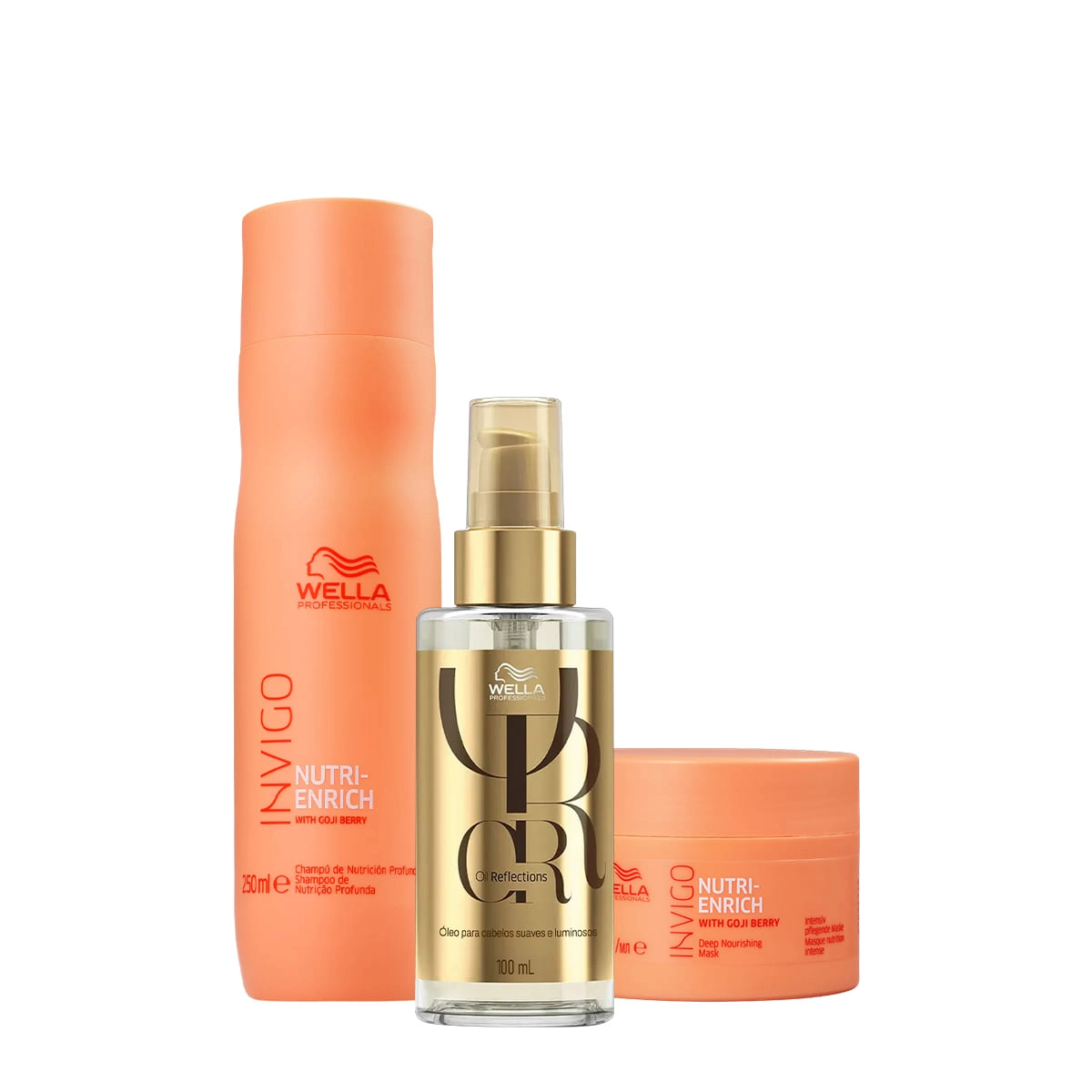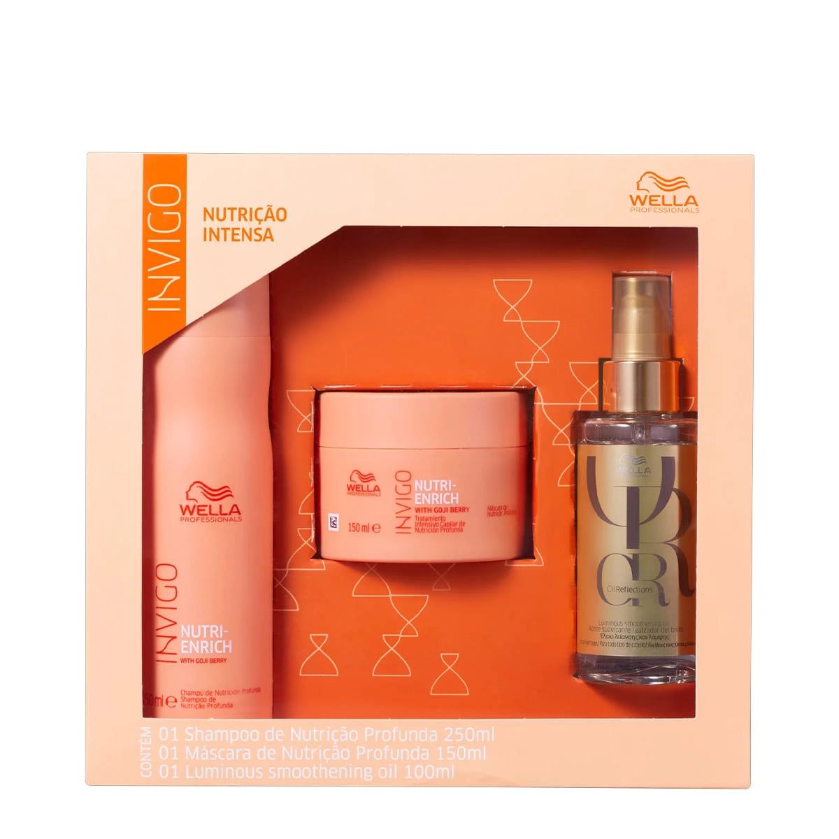 Este Kit Contém Wella Professionals Invigo Nutri-Enrich - Shampoo 1L: tem o poder de hidratar e nutrir os fios desde o momento da lavagem e, assim, vai muito além de limpar. Wella Professionals Invigo Nutri-Enrich - Máscara Capilar 500ml: tratamento intensivo com nutrição capilar que hidrata e nutre profundamente para restaurar a saúde dos fios e garantir um toque sedoso e muito brilho. Wella Professionals Oil Reflections Luminous Smoothening - Óleo Capilar 100ml: protege, nutre e deixa o cabelo macio, com efeito gloss. É mais nutritivo, sendo indicado para cabelos que precisam de uma carga maior de nutrientes e brilho. Conselho de AplicaçãoWella Professionals Kit Invigo Nutri-Enrich Oil Reflections Caixa Presente (3 produtos)