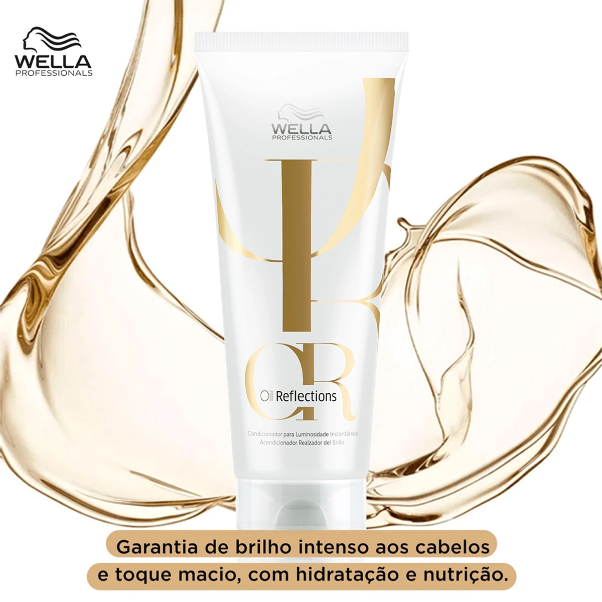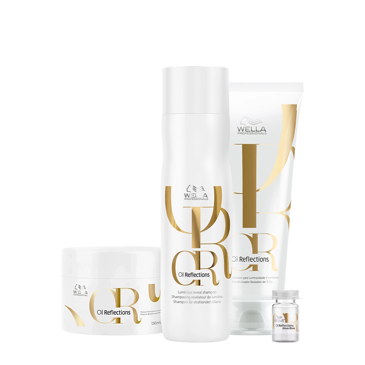 Kit Wella Oil Reflections Shampoo 250ml + Condicionador 200ml + Máscara 150ml 01 - Ampola Capilar 60ml Wella Professionals Oil Reflections Luminous Magnifying Elixir Sérum Ampola de tratamento para cabelos de todos os tipos. Wella Oil Reflections Luminous Magnifying Elixir Sérum deixa cabelo suave, com efeito gloss extra brilho e anti-frizz. Wella Oil Reflections Luminous Magnifying Elixir Sérum tem um efeito antifrizz de até 72 horas. Um tratamento que deixa o cabelo perfeito. Conselho de Aplicação Para um cabelo mais fino, aplique somente a ampola, um cabelo mais grosso ou danificado, misture a ampola e máscara da linha. Para cada serviço, use meia ampola. Distribua uniformemente sobre o cabelo. Espere de 5 a 10 minutos e enxague abundantemente. O efeito pode ser intensificado com o calor.