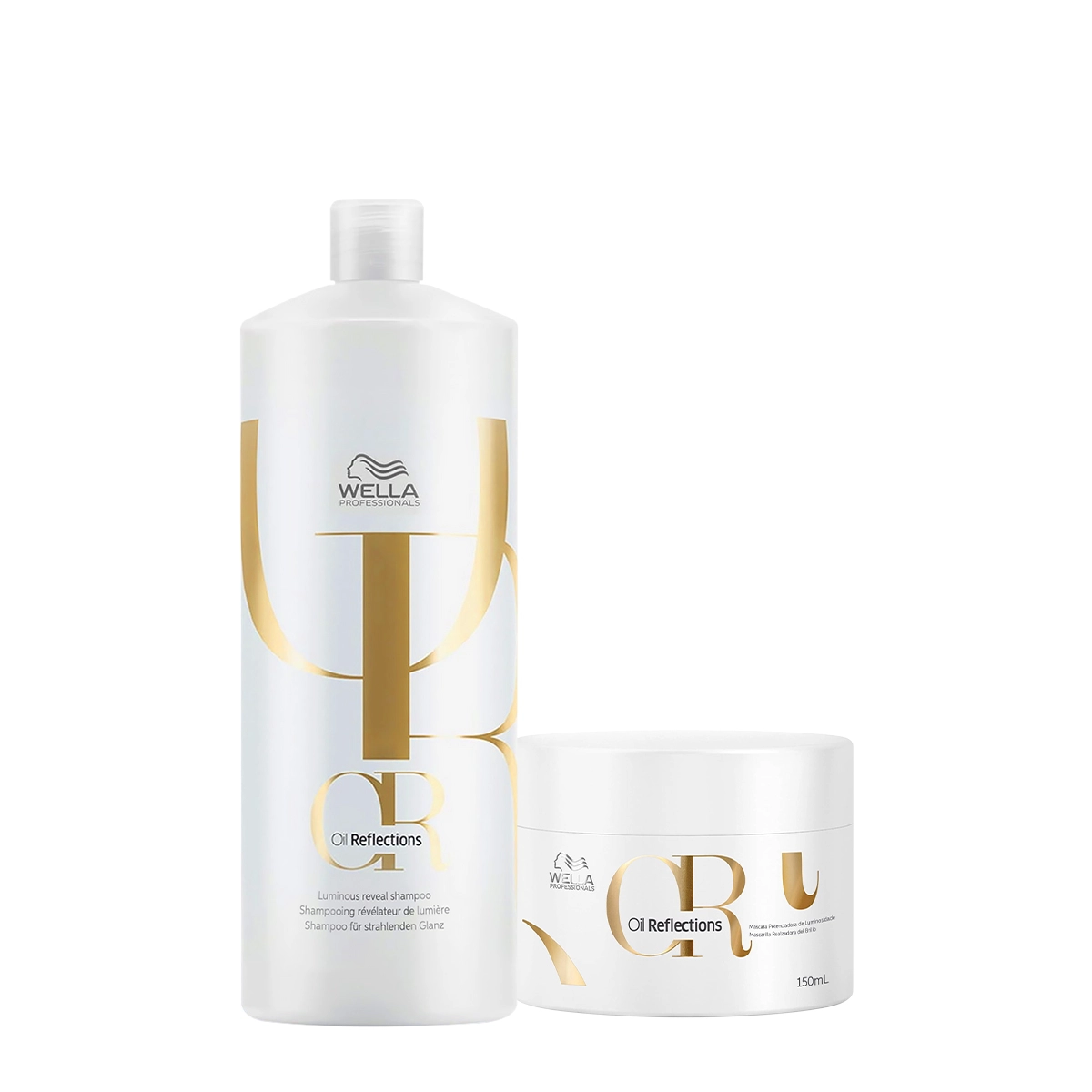 Wella Professionals Oil Reflections Shampoo 1L+Mascara 150ml Spa de maciez e luminosidade para todos os tipos de cabelo, tamanho salão. Kit Wella Professionals Oil Reflections Duo Salão promove nutrição e proteção da cor. Kit Wella Professionals Oil Reflections Duo Salão trata o cabelo e devolve a ele o que é mais exigido por clientes em salões hoje em dia, maciez extrema e brilho. Contém Wella Professionals Oil Reflections Luminous Reveal - Shampoo 1000ml: condiciona levemente aos fios com luminosidade e maciez. Wella Professionals Oil Reflections Luminous Reboost - Máscara 150ml: deixa os fios luminosos, macios e restaura a estrutura capilar. Hidrata profundamente, ajudando a promover menos perda de água dos fios. Ação Extrato de Chá Branco: antioxidante natural. Óleo de Semente de Camélia: cicatrização e selagem do fio. Fragrância: no topo Romã, Pêssego e Flor de Baunilha; no corpo Peônia, Coco e Jasmim; no fundo Almíscar, Baunilha e Cedro. Conselho de Aplicação Aplique o shampoo de textura gel transparente no couro cabeludo e enluve os fios, sem esfregá-los. Enxágue em seguida e retire completamente o produto. Repita caso sinta necessidade. Aplique a máscara nos fios e enluve. Deixe agir de 15 a 20 minutos e enxague. Resultado Cabelo profundamente hidratado e nutrido, luminoso e macio.